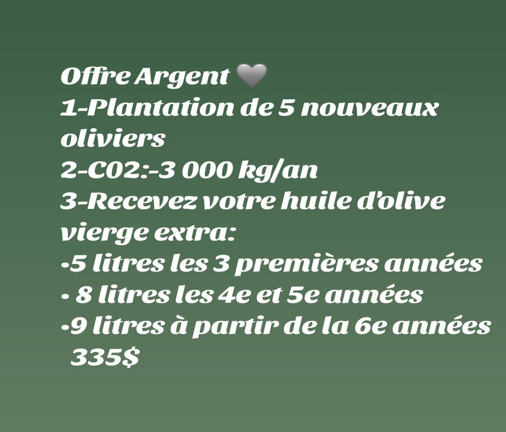 3-Chaque année, nous vous enverrons l'huile d'olive extra vierge bio produite à partir de votre arbre ( dont la quantité augmente chaque année au fur et à mesure de la croissance de l'olivier).